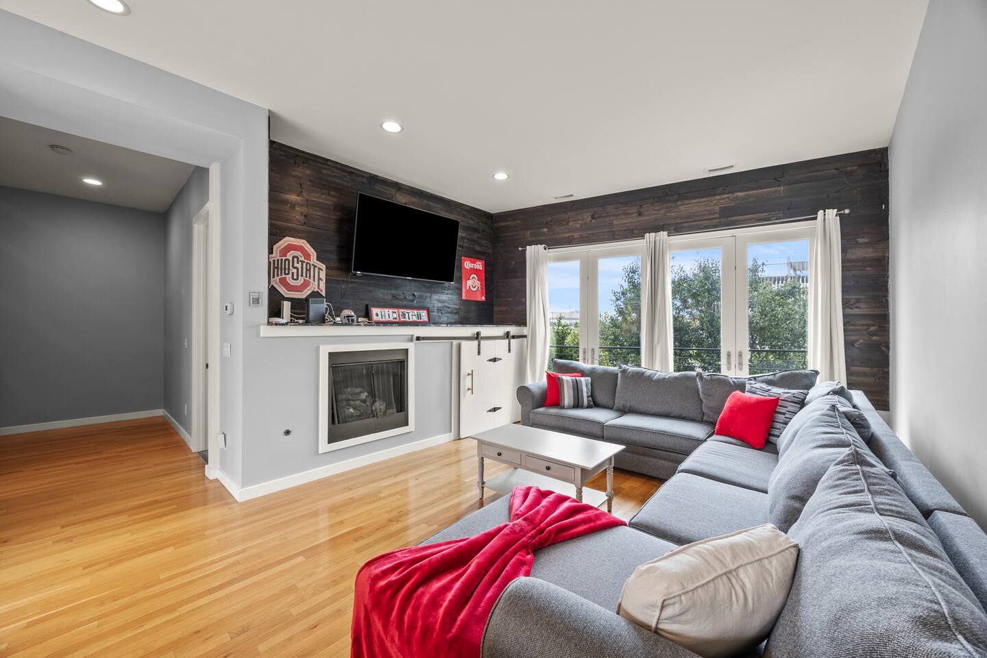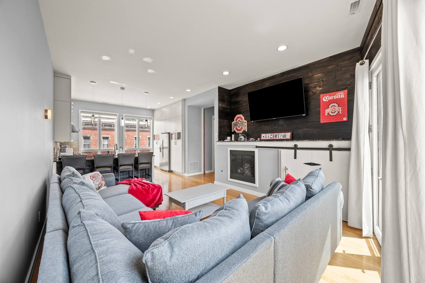 The Russell St Tower is cohosted by Stupendous Stays. Stupendous Stays is a small, family run hospitality company in Columbus. KEY FEATURES: 🛏️ 4 bedrooms; 1 king, 3 queens 🛁 2.5 bathrooms; complimentary toiletries 🐶 DOG FRIENDLY (Dogs are allowed on a case by case basis. Requires approval before booking.) There is no yard area. 🌃4th story rooftop deck with city skyline views and outdoor furniture 🧑🍳 Full kitchen w/ stainless steel appliances + coffee maker 🏠 Bright, spacious living area 🔊 Bluetooth speaker in living room 🧑🧑🧒🧒 Family-friendly space w/ board games + kids games 🛜 High-speed wifi + Smart TVs (65" Roku TV living room and 55" in primary bedroom) 🅿️ Free one car attached garage parking. Paid street parking also available. ⭐️⭐️⭐️⭐️⭐️ Expect a Five Star stay with us. We have a full digital concierge to assist with booking activities, reservations, and more. Here’s what a few guests have said about their stay at our other properties: 🗣️ "Evan was an amazing host and the property is absolutely stunning! This was one of the best stays we’ve ever had. Please book this place for your next stay! " -Brittany ✨ "Evan was an awesome host! We were in town for a wedding and his space held 10 of us comfortably. It was right next to where we had to go and parking was also very accessible. Evan was very fast to respond to me and was checking in to make sure everything went smoothly. Would definitely recommend staying here!" -Megan Stupendous Stays/The Russell would love to be your home base for your Columbus travels! ⭐️⭐️⭐️⭐️⭐️ ☆☆ BEDROOMS ☆☆ This urban retreat features four bedrooms, so you can enjoy a unique and relaxing sanctuary at the end of the day. Each bedroom is equipped with a white noise machine and memory foam mattresses. You’ll find one bedrooms on the first floor. The first bedroom contains a plush queen-sized bed. You’ll also find a closet with a pack-n-play, a stroller, and travel crib, so you don’t have to worry about bringing your own. The second bedroom is located on the 2nd floor and features a cushy queen-sized bed. The third and fourth bedrooms are on the third floor. The primary bedroom features a king sized bed and 55" Roku smart TV. Make your way up to the top floor where you’ll find the rooftop patio with breath taking view of the city. ☆☆ BATHROOMS ☆☆ The pristine bathrooms are the perfect place to get ready for your day on the town! There are two full bathrooms, each equipped with a hairdryer, fresh towels (including makeup towels), and Ginger Lily Farms shampoo, conditioner, and body wash. On the first floor, you’ll find one full bath with a tub/steam shower combo. The second floor has a half bathroom and exposed brick, adding to the modern charm of the home Finally, you’ll also find a full bath on the third floor featuring a tiled walk in shower. Shampoo, conditioner, and body wash provided. ☆☆ KITCHEN & DINING ☆☆ Whip up delicious meals in the sophisticated fully-equipped kitchen. You’ll find everything you’ll need, including an extensive array of cookware and dish-ware, so you never have to fret about running out of pots, pans, or cooking utensils. Chefs of your group will adore the high-end stainless steel appliances, sleek countertops, and exquisite cabinets. Enjoy a quick cleanup using the dishwasher. Dishwashing pods will be provided so you don’t have to worry about picking them up at the grocery store. Start your morning with a cup of coffee, fresh from the complimentary coffee bar stocked with ground coffee, K-cups, cream, sugar and sweeteners. You can enjoy your beverage of choice at the sleek kitchen island by pulling up one of three stools. If you’re traveling with little ones, help yourself to the high chair located in the cabinet to the left of the fridge. ☆☆ LOUNGE ☆☆ Sit back on the sectional sofa and watch your favorite movie on the 75'' Roku TV for an immersive experience. When you’re not watching movies, enjoy some board games while kids of the group take advantage of the complimentary games. ☆☆ OUTSIDE SPACE ☆☆ Enjoy some fresh air on the lovely rooftop patio featuring string lights and seating. Ideally located only a short distance from many of the popular places in Columbus, including Ohio Arena, OSU, the Convention Center, and downtown, you’ll have everything you’ll need for a fabulous stay at your fingertips. Explore some of the local bars or discover the small boutiques that Columbus has to offer. ★☆ Book Today & Let Stupendous Stays Take Care Of You In Columbus! ☆★