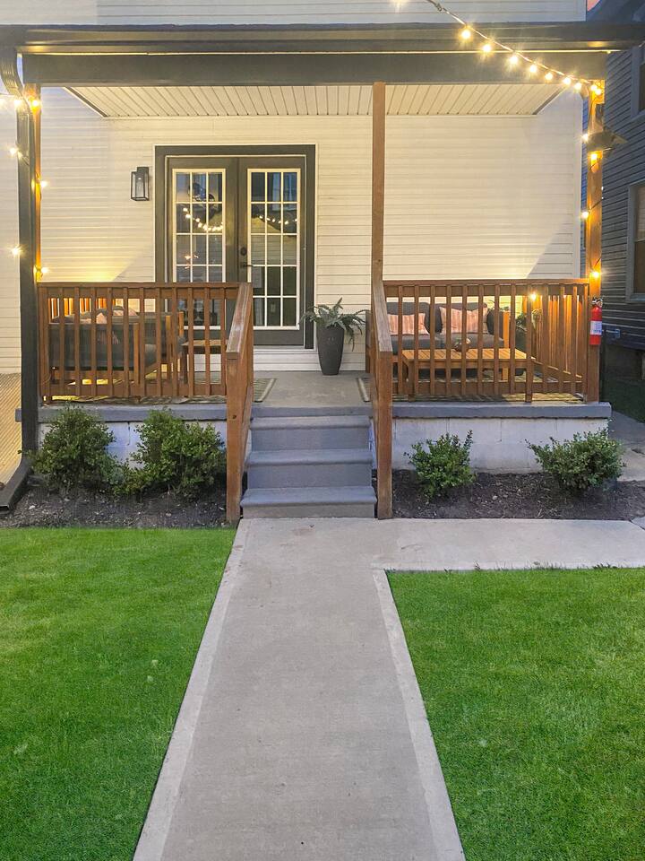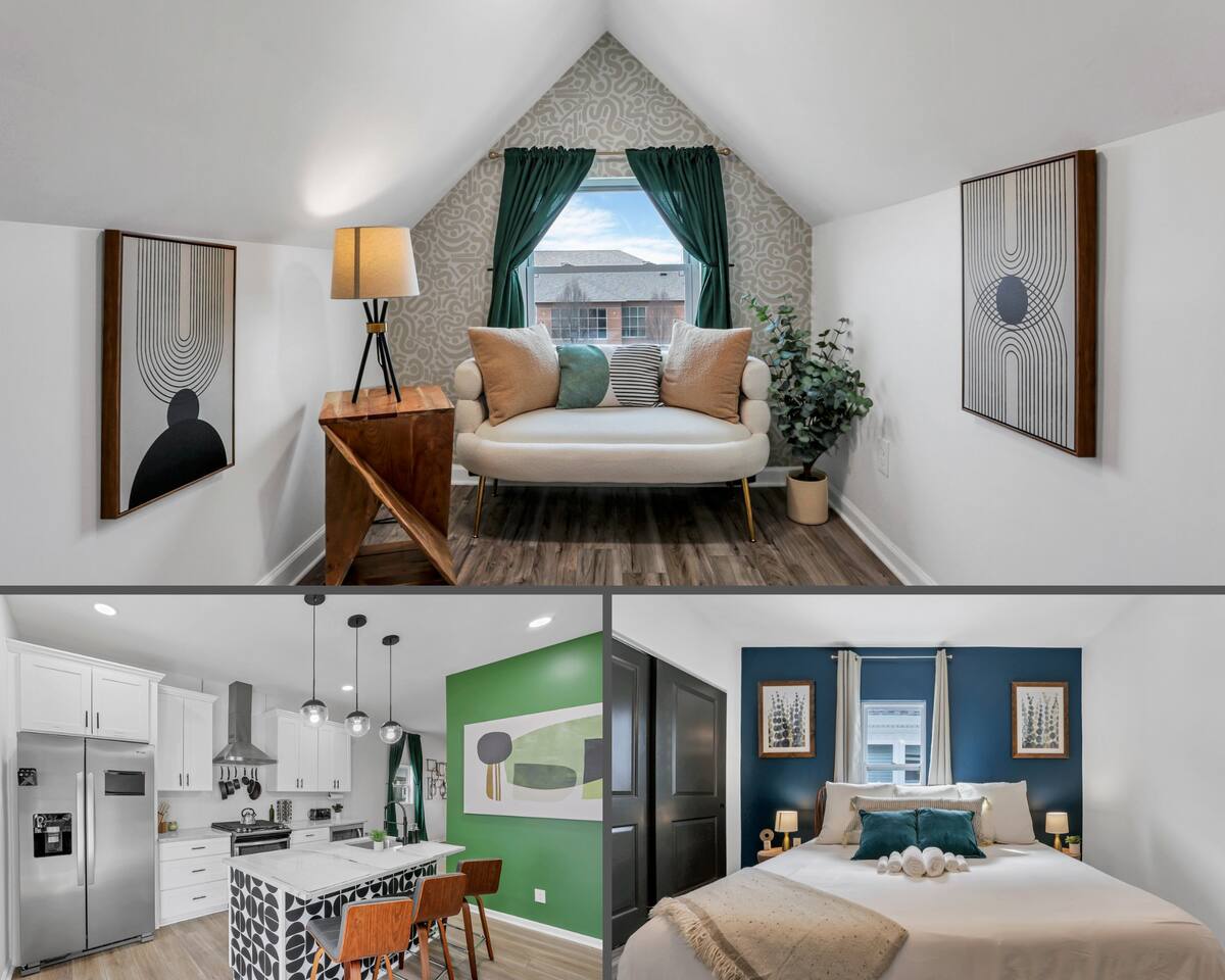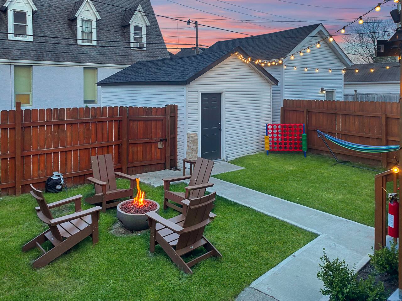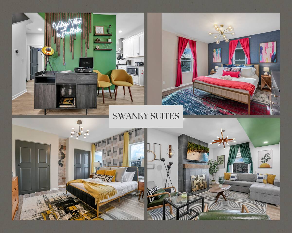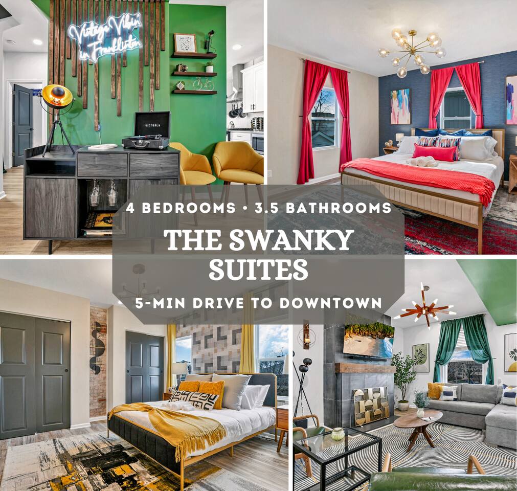 Swanky Suites is a Stupendous Stays property. Stupendous Stays is a small, family run hospitality company. KEY FEATURES: 🛏️ 4 bedrooms; 2 kings, 3 queens, 1 full size sofa bed 🛁 3.5 bathrooms; complimentary toiletries 🐶 DOG FRIENDLY (Dogs are allowed on a case by case basis. Requires approval before booking.) Mostly fenced in backyard. There is a 3-4' opening. 🧑🍳 Full kitchen w/ stainless steel appliances + coffee/tea bar 🏠 Bright, spacious living area 🔊 Record player and bluetooth soundbar in living room 🧑🧑🧒🧒 Family-friendly space w/ board games + coloring materials 🛜 High-speed wifi (FIBER) + Smart TVs 🧑💻 Workspace w/ monitors, mice, printer + ultra comfortable chairs 🅿️ Free parking street parking ⚽️ Backyard w/ fire pit, outdoor games, hammock ⭐️⭐️⭐️⭐️⭐️ Expect a Five Star stay with us. We have a full digital concierge to assist with booking activities, reservations, and more. Here’s what a few guests have said: 🗣️ "Evan was an amazing host and the property is absolutely stunning! This was one of the best stays we’ve ever had. Please book this place for your next stay! " -Brittany ✨ "Evan was an awesome host! We were in town for a wedding and his space held 10 of us comfortably. It was right next to where we had to go and parking was also very accessible. Evan was very fast to respond to me and was checking in to make sure everything went smoothly. Would definitely recommend staying here!" -Megan Stupendous Stays/Swanky Suites would love to be your home base for your Columbus travels! ⭐️⭐️⭐️⭐️⭐️ ☆☆ BEDROOMS ☆☆ This upscale retreat features four custom-designed bedrooms, so you can enjoy a unique and relaxing sanctuary at the end of the day. Each bedroom is equipped with a white noise machine, memory foam mattresses, and a Smart TV for your convenience. You’ll find three spacious bedrooms on the second floor. The first bedroom contains a plush king-sized bed with colorful accents and plenty of closet space to unpack all your belongings. Enjoy your favorite programs on the 43” Roku TV. The second bedroom features tranquil blue tones and a cushy king-sized bed. You’ll also find a closet with a pack-n-play, a stroller, and child safety items, so you don’t have to worry about bringing your own. There’s also a 55” Roku TV in this room. The third bedroom on the second floor features modern details, a comfy queen-sized bed, and an ensuite bathroom for ultimate privacy. There’s also a 55” Roku TV in this room. Make your way up to the top floor where you’ll find the fourth bedroom. Boasting two queen-sized beds, a cozy reading nook, and a stylish dresser, you’ll have everything you’ll need for a comfortable and unforgettable experience. There’s also a 55” Roku TV in this room. Each bedroom has a white noise machine and tower fan in it as well. If you need a little extra space to accommodate your group, there’s also a sofa bed in the living room. ☆☆ BATHROOMS ☆☆ The pristine bathrooms are the perfect place to get ready for your day on the town! There are three full bathrooms, each equipped with a hairdryer, fresh towels (including makeup towels), and Ginger Lily Farms shampoo, conditioner, and body wash. On the second floor, you’ll find two full baths, one boasting a beautiful tiled walk-in shower and the second containing a shower/tub combination, so you can choose between a relaxing soak or a quick rinse. The third floor has a spacious full bathroom with a tiled walk-in shower, a double vanity, and exposed brick, adding to the modern charm of the home Finally, you’ll also find a half bath on the main floor to cater to the common areas. In the half bath, there is a washer and dryer to keep your clothes clean! Laundry soap, a vacuum, a broom, and an iron and ironing board can all be found in the laundry room cabinet ☆☆ KITCHEN & DINING ☆☆ Whip up delicious meals in the sophisticated fully-equipped kitchen. You’ll find everything you’ll need, including an extensive array of cookware and dish-ware, so you never have to fret about running out of pots, pans, or cooking utensils. Chefs of your group will adore the high-end stainless steel appliances, sleek countertops, and exquisite cabinets. Enjoy a quick cleanup using the dishwasher. Dishwashing pods will be provided so you don’t have to worry about picking them up at the grocery store. In the fridge, you’ll even find complimentary butter, sugar, baking soda, and condiments for your convenience. Start your morning with a cup of coffee or tea, fresh from the complimentary coffee bar, stocked with whole bean and ground coffee, K-cups, cream, sugar, sweeteners, and tea. You can enjoy your beverage of choice at the sleek kitchen island by pulling up one of three stools. When you’re ready for a formal meal, make your way into the large dining area. Take a seat around the beautiful wooden dining table that can comfortably seat up to eight guests. Additional guests can enjoy dinner at the kitchen counter and still socialize, thanks to the open-concept layout. If you’re traveling with little ones, help yourself to the high chair located in the laundry room. The record player is located just beside the dining table, so you can enjoy some enchanting tunes while digging in. ☆☆ LOUNGE ☆☆ As you enter the home through the front door, you’ll be greeted by the swanky neon sign, a record player, and the contemporary lounge flooded with natural light. This chic space is the perfect place to gather with your group and enjoy quality time. Sit back on the sectional sofa and watch your favorite movie on the 65'' Roku TV with a soundbar for an immersive experience. When you’re not watching movies, enjoy some board games while kids of the group take advantage of the complimentary coloring books. ☆☆ HOME OFFICE ☆☆ Need to get some work done during your stay? You’ll find an unparal