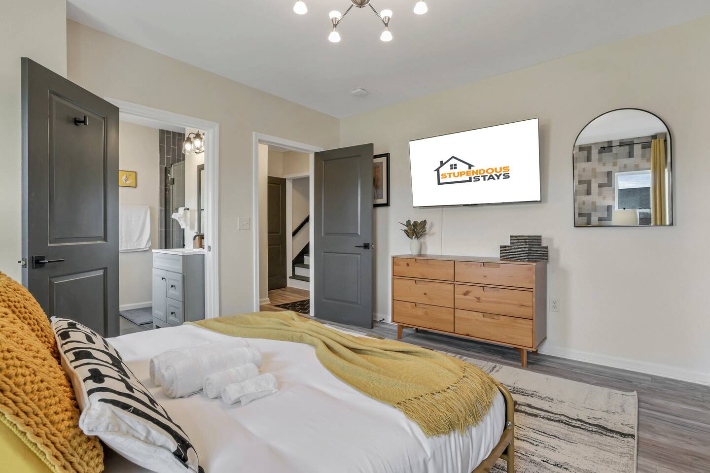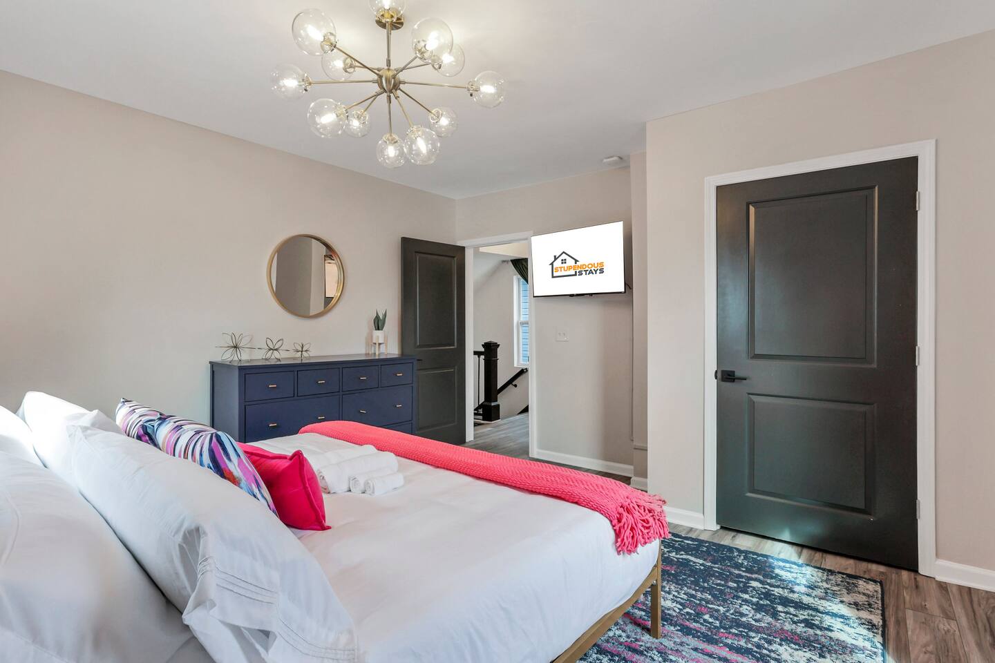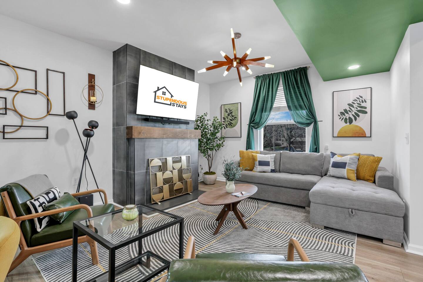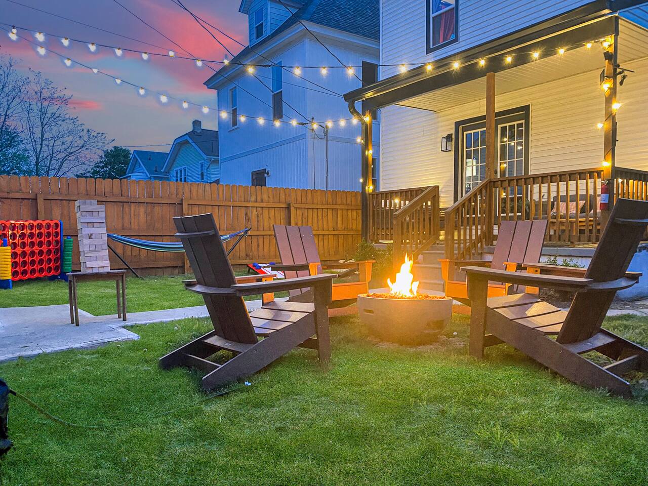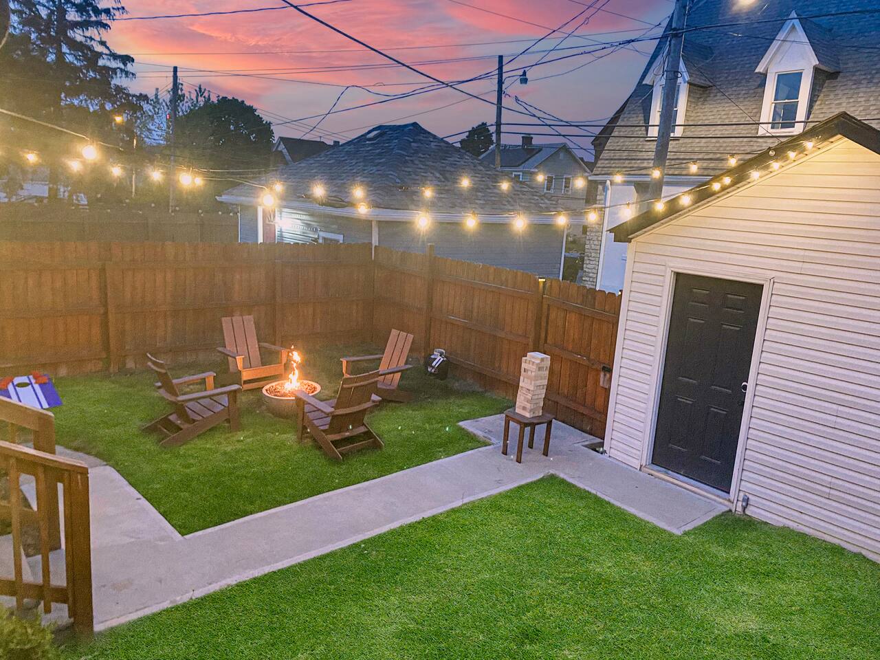 Swanky Suites is a Stupendous Stays property. Stupendous Stays is a small, family run hospitality company. KEY FEATURES: 🛏️ 4 bedrooms; 2 kings, 3 queens, 1 full size sofa bed 🛁 3.5 bathrooms; complimentary toiletries 🐶 DOG FRIENDLY (Dogs are allowed on a case by case basis. Requires approval before booking.) Mostly fenced in backyard. There is a 3-4' opening. 🧑🍳 Full kitchen w/ stainless steel appliances + coffee/tea bar 🏠 Bright, spacious living area 🔊 Record player and bluetooth soundbar in living room 🧑🧑🧒🧒 Family-friendly space w/ board games + coloring materials 🛜 High-speed wifi (FIBER) + Smart TVs 🧑💻 Workspace w/ monitors, mice, printer + ultra comfortable chairs 🅿️ Free parking street parking ⚽️ Backyard w/ fire pit, outdoor games, hammock ⭐️⭐️⭐️⭐️⭐️ Expect a Five Star stay with us. We have a full digital concierge to assist with booking activities, reservations, and more. Here’s what a few guests have said: 🗣️ "Evan was an amazing host and the property is absolutely stunning! This was one of the best stays we’ve ever had. Please book this place for your next stay! " -Brittany ✨ "Evan was an awesome host! We were in town for a wedding and his space held 10 of us comfortably. It was right next to where we had to go and parking was also very accessible. Evan was very fast to respond to me and was checking in to make sure everything went smoothly. Would definitely recommend staying here!" -Megan Stupendous Stays/Swanky Suites would love to be your home base for your Columbus travels! ⭐️⭐️⭐️⭐️⭐️ ☆☆ BEDROOMS ☆☆ This upscale retreat features four custom-designed bedrooms, so you can enjoy a unique and relaxing sanctuary at the end of the day. Each bedroom is equipped with a white noise machine, memory foam mattresses, and a Smart TV for your convenience. You’ll find three spacious bedrooms on the second floor. The first bedroom contains a plush king-sized bed with colorful accents and plenty of closet space to unpack all your belongings. Enjoy your favorite programs on the 43” Roku TV. The second bedroom features tranquil blue tones and a cushy king-sized bed. You’ll also find a closet with a pack-n-play, a stroller, and child safety items, so you don’t have to worry about bringing your own. There’s also a 55” Roku TV in this room. The third bedroom on the second floor features modern details, a comfy queen-sized bed, and an ensuite bathroom for ultimate privacy. There’s also a 55” Roku TV in this room. Make your way up to the top floor where you’ll find the fourth bedroom. Boasting two queen-sized beds, a cozy reading nook, and a stylish dresser, you’ll have everything you’ll need for a comfortable and unforgettable experience. There’s also a 55” Roku TV in this room. Each bedroom has a white noise machine and tower fan in it as well. If you need a little extra space to accommodate your group, there’s also a sofa bed in the living room. ☆☆ BATHROOMS ☆☆ The pristine bathrooms are the perfect place to get ready for your day on the town! There are three full bathrooms, each equipped with a hairdryer, fresh towels (including makeup towels), and Ginger Lily Farms shampoo, conditioner, and body wash. On the second floor, you’ll find two full baths, one boasting a beautiful tiled walk-in shower and the second containing a shower/tub combination, so you can choose between a relaxing soak or a quick rinse. The third floor has a spacious full bathroom with a tiled walk-in shower, a double vanity, and exposed brick, adding to the modern charm of the home Finally, you’ll also find a half bath on the main floor to cater to the common areas. In the half bath, there is a washer and dryer to keep your clothes clean! Laundry soap, a vacuum, a broom, and an iron and ironing board can all be found in the laundry room cabinet ☆☆ KITCHEN & DINING ☆☆ Whip up delicious meals in the sophisticated fully-equipped kitchen. You’ll find everything you’ll need, including an extensive array of cookware and dish-ware, so you never have to fret about running out of pots, pans, or cooking utensils. Chefs of your group will adore the high-end stainless steel appliances, sleek countertops, and exquisite cabinets. Enjoy a quick cleanup using the dishwasher. Dishwashing pods will be provided so you don’t have to worry about picking them up at the grocery store. In the fridge, you’ll even find complimentary butter, sugar, baking soda, and condiments for your convenience. Start your morning with a cup of coffee or tea, fresh from the complimentary coffee bar, stocked with whole bean and ground coffee, K-cups, cream, sugar, sweeteners, and tea. You can enjoy your beverage of choice at the sleek kitchen island by pulling up one of three stools. When you’re ready for a formal meal, make your way into the large dining area. Take a seat around the beautiful wooden dining table that can comfortably seat up to eight guests. Additional guests can enjoy dinner at the kitchen counter and still socialize, thanks to the open-concept layout. If you’re traveling with little ones, help yourself to the high chair located in the laundry room. The record player is located just beside the dining table, so you can enjoy some enchanting tunes while digging in. ☆☆ LOUNGE ☆☆ As you enter the home through the front door, you’ll be greeted by the swanky neon sign, a record player, and the contemporary lounge flooded with natural light. This chic space is the perfect place to gather with your group and enjoy quality time. Sit back on the sectional sofa and watch your favorite movie on the 65'' Roku TV with a soundbar for an immersive experience. When you’re not watching movies, enjoy some board games while kids of the group take advantage of the complimentary coloring books. ☆☆ HOME OFFICE ☆☆ Need to get some work done during your stay? You’ll find an unparal