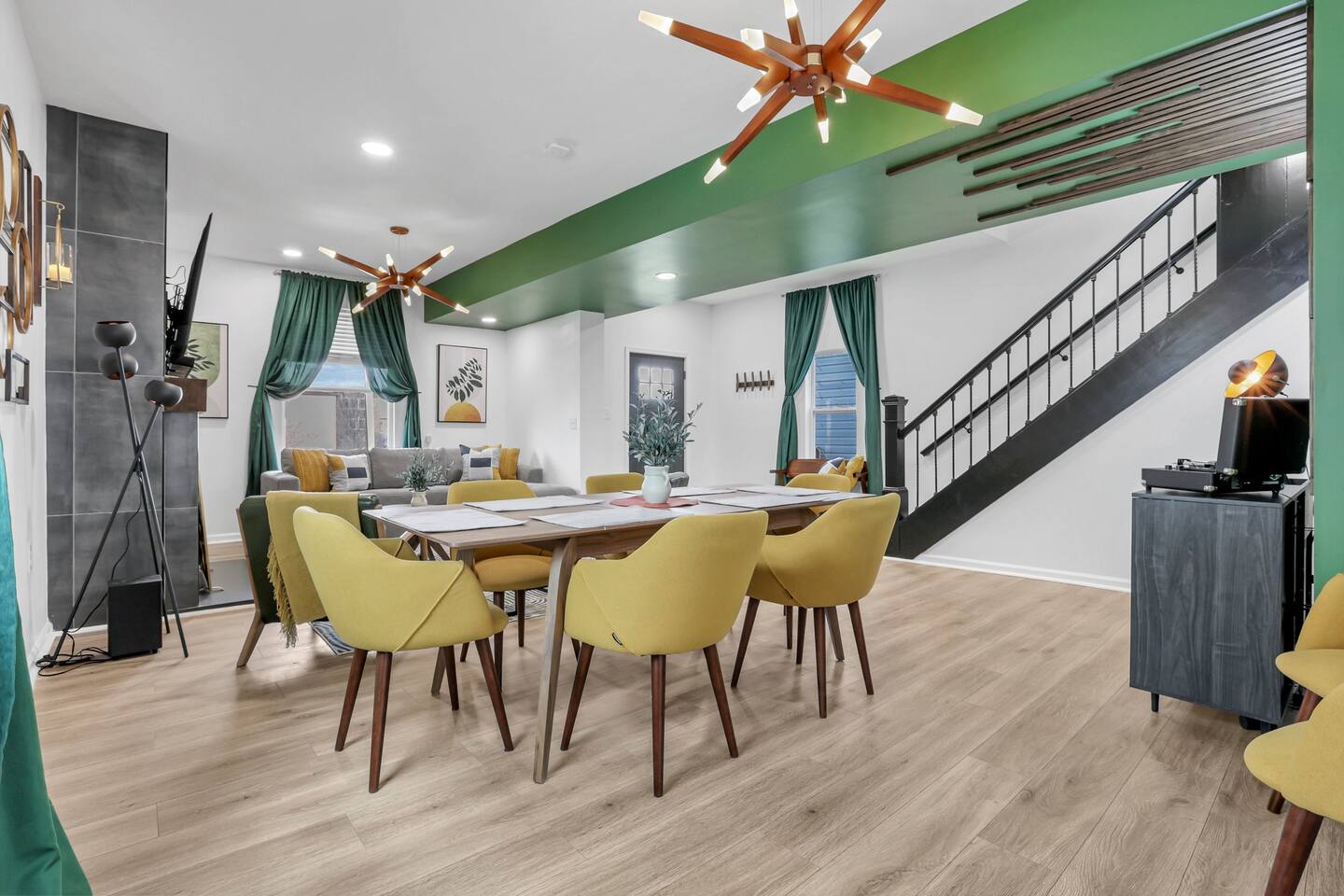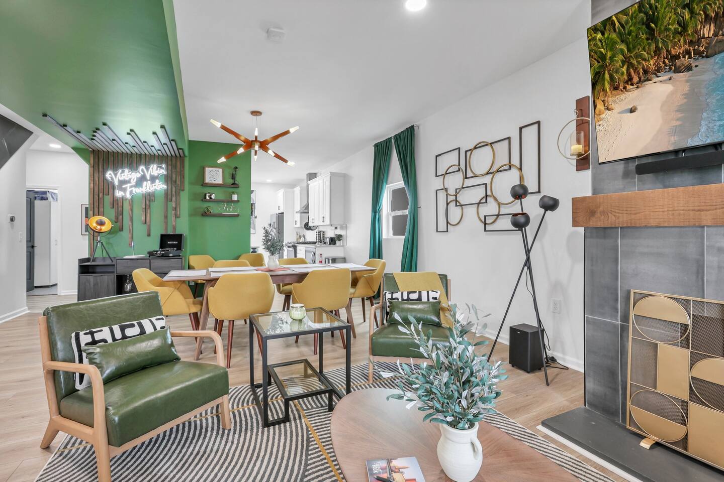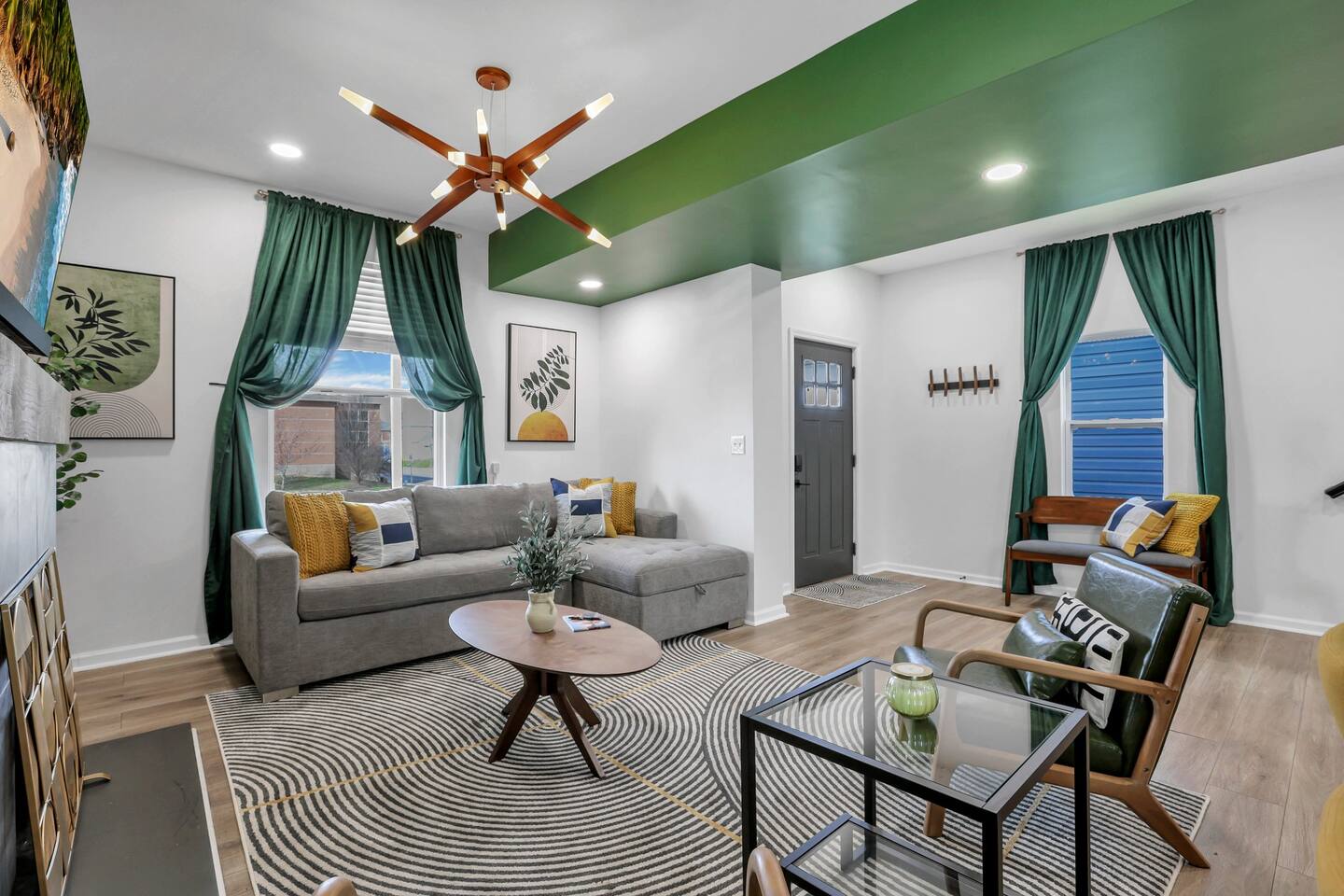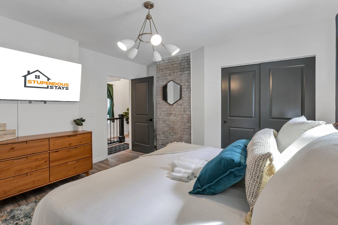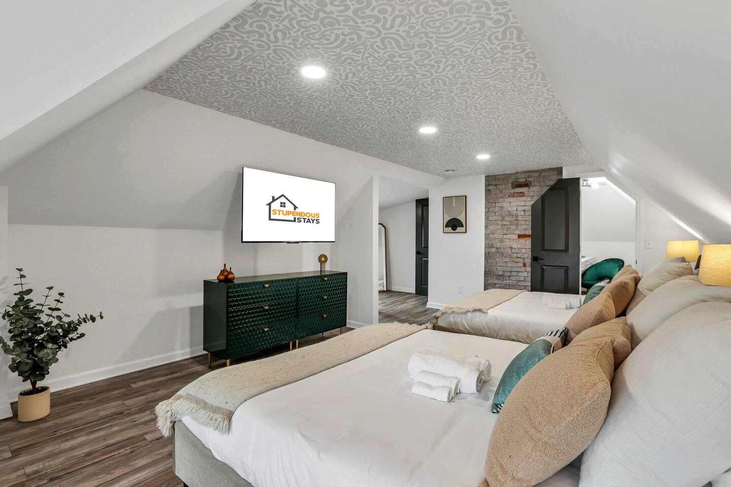 Swanky Suites is a Stupendous Stays property. Stupendous Stays is a small, family run hospitality company. KEY FEATURES: 🛏️ 4 bedrooms; 2 kings, 3 queens, 1 full size sofa bed 🛁 3.5 bathrooms; complimentary toiletries 🐶 DOG FRIENDLY (Dogs are allowed on a case by case basis. Requires approval before booking.) Mostly fenced in backyard. There is a 3-4' opening. 🧑🍳 Full kitchen w/ stainless steel appliances + coffee/tea bar 🏠 Bright, spacious living area 🔊 Record player and bluetooth soundbar in living room 🧑🧑🧒🧒 Family-friendly space w/ board games + coloring materials 🛜 High-speed wifi (FIBER) + Smart TVs 🧑💻 Workspace w/ monitors, mice, printer + ultra comfortable chairs 🅿️ Free parking street parking ⚽️ Backyard w/ fire pit, outdoor games, hammock ⭐️⭐️⭐️⭐️⭐️ Expect a Five Star stay with us. We have a full digital concierge to assist with booking activities, reservations, and more. Here’s what a few guests have said: 🗣️ "Evan was an amazing host and the property is absolutely stunning! This was one of the best stays we’ve ever had. Please book this place for your next stay! " -Brittany ✨ "Evan was an awesome host! We were in town for a wedding and his space held 10 of us comfortably. It was right next to where we had to go and parking was also very accessible. Evan was very fast to respond to me and was checking in to make sure everything went smoothly. Would definitely recommend staying here!" -Megan Stupendous Stays/Swanky Suites would love to be your home base for your Columbus travels! ⭐️⭐️⭐️⭐️⭐️ ☆☆ BEDROOMS ☆☆ This upscale retreat features four custom-designed bedrooms, so you can enjoy a unique and relaxing sanctuary at the end of the day. Each bedroom is equipped with a white noise machine, memory foam mattresses, and a Smart TV for your convenience. You’ll find three spacious bedrooms on the second floor. The first bedroom contains a plush king-sized bed with colorful accents and plenty of closet space to unpack all your belongings. Enjoy your favorite programs on the 43” Roku TV. The second bedroom features tranquil blue tones and a cushy king-sized bed. You’ll also find a closet with a pack-n-play, a stroller, and child safety items, so you don’t have to worry about bringing your own. There’s also a 55” Roku TV in this room. The third bedroom on the second floor features modern details, a comfy queen-sized bed, and an ensuite bathroom for ultimate privacy. There’s also a 55” Roku TV in this room. Make your way up to the top floor where you’ll find the fourth bedroom. Boasting two queen-sized beds, a cozy reading nook, and a stylish dresser, you’ll have everything you’ll need for a comfortable and unforgettable experience. There’s also a 55” Roku TV in this room. Each bedroom has a white noise machine and tower fan in it as well. If you need a little extra space to accommodate your group, there’s also a sofa bed in the living room. ☆☆ BATHROOMS ☆☆ The pristine bathrooms are the perfect place to get ready for your day on the town! There are three full bathrooms, each equipped with a hairdryer, fresh towels (including makeup towels), and Ginger Lily Farms shampoo, conditioner, and body wash. On the second floor, you’ll find two full baths, one boasting a beautiful tiled walk-in shower and the second containing a shower/tub combination, so you can choose between a relaxing soak or a quick rinse. The third floor has a spacious full bathroom with a tiled walk-in shower, a double vanity, and exposed brick, adding to the modern charm of the home Finally, you’ll also find a half bath on the main floor to cater to the common areas. In the half bath, there is a washer and dryer to keep your clothes clean! Laundry soap, a vacuum, a broom, and an iron and ironing board can all be found in the laundry room cabinet ☆☆ KITCHEN & DINING ☆☆ Whip up delicious meals in the sophisticated fully-equipped kitchen. You’ll find everything you’ll need, including an extensive array of cookware and dish-ware, so you never have to fret about running out of pots, pans, or cooking utensils. Chefs of your group will adore the high-end stainless steel appliances, sleek countertops, and exquisite cabinets. Enjoy a quick cleanup using the dishwasher. Dishwashing pods will be provided so you don’t have to worry about picking them up at the grocery store. In the fridge, you’ll even find complimentary butter, sugar, baking soda, and condiments for your convenience. Start your morning with a cup of coffee or tea, fresh from the complimentary coffee bar, stocked with whole bean and ground coffee, K-cups, cream, sugar, sweeteners, and tea. You can enjoy your beverage of choice at the sleek kitchen island by pulling up one of three stools. When you’re ready for a formal meal, make your way into the large dining area. Take a seat around the beautiful wooden dining table that can comfortably seat up to eight guests. Additional guests can enjoy dinner at the kitchen counter and still socialize, thanks to the open-concept layout. If you’re traveling with little ones, help yourself to the high chair located in the laundry room. The record player is located just beside the dining table, so you can enjoy some enchanting tunes while digging in. ☆☆ LOUNGE ☆☆ As you enter the home through the front door, you’ll be greeted by the swanky neon sign, a record player, and the contemporary lounge flooded with natural light. This chic space is the perfect place to gather with your group and enjoy quality time. Sit back on the sectional sofa and watch your favorite movie on the 65'' Roku TV with a soundbar for an immersive experience. When you’re not watching movies, enjoy some board games while kids of the group take advantage of the complimentary coloring books. ☆☆ HOME OFFICE ☆☆ Need to get some work done during your stay? You’ll find an unparal
