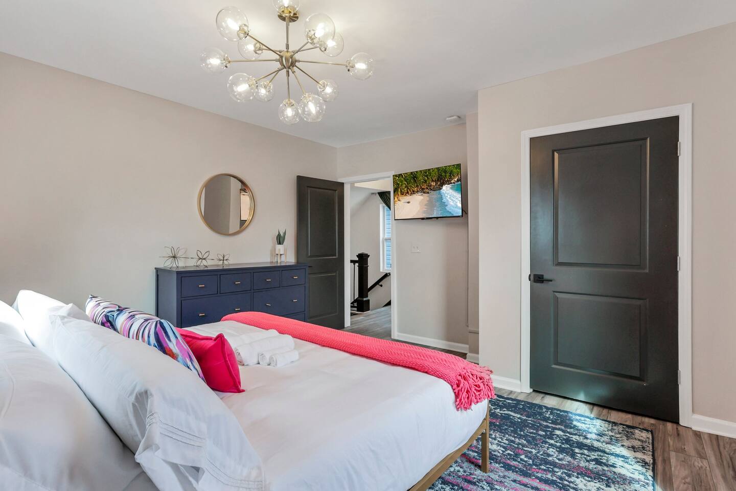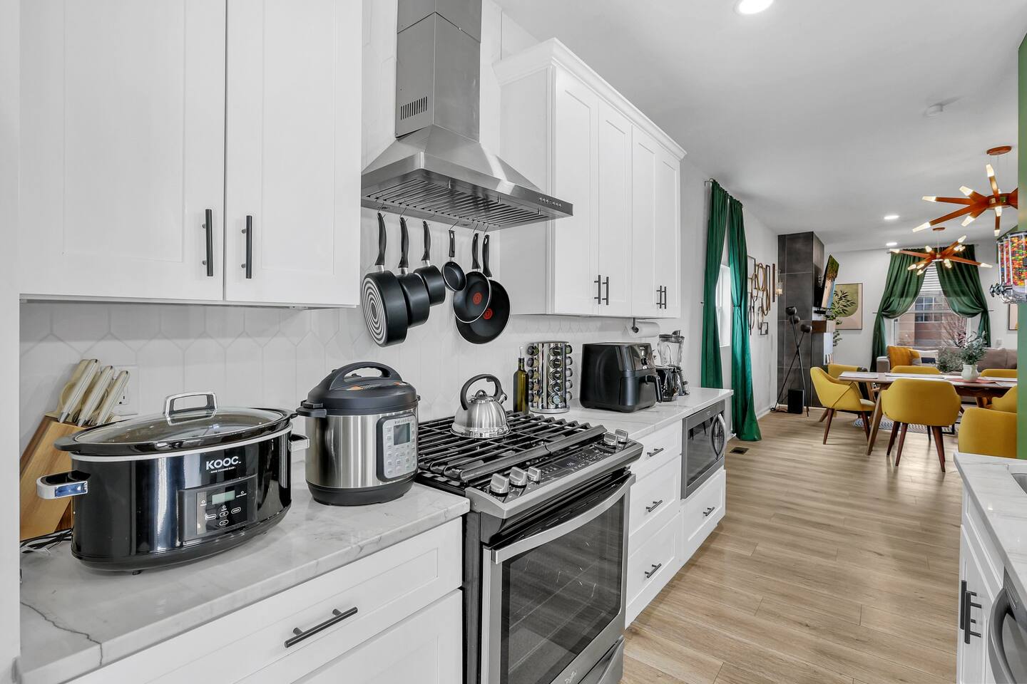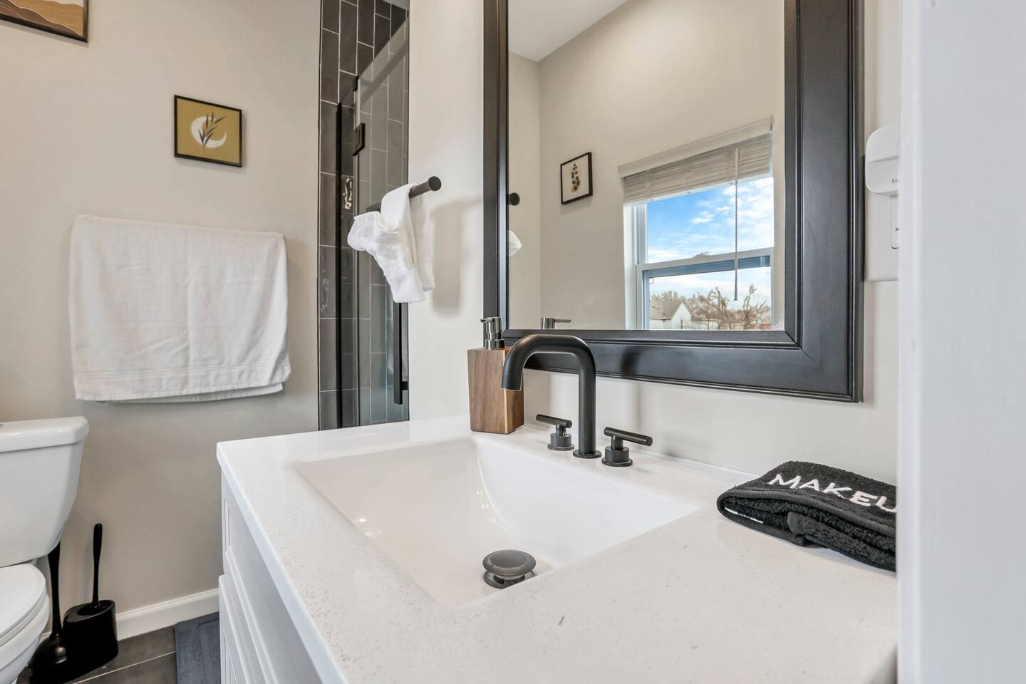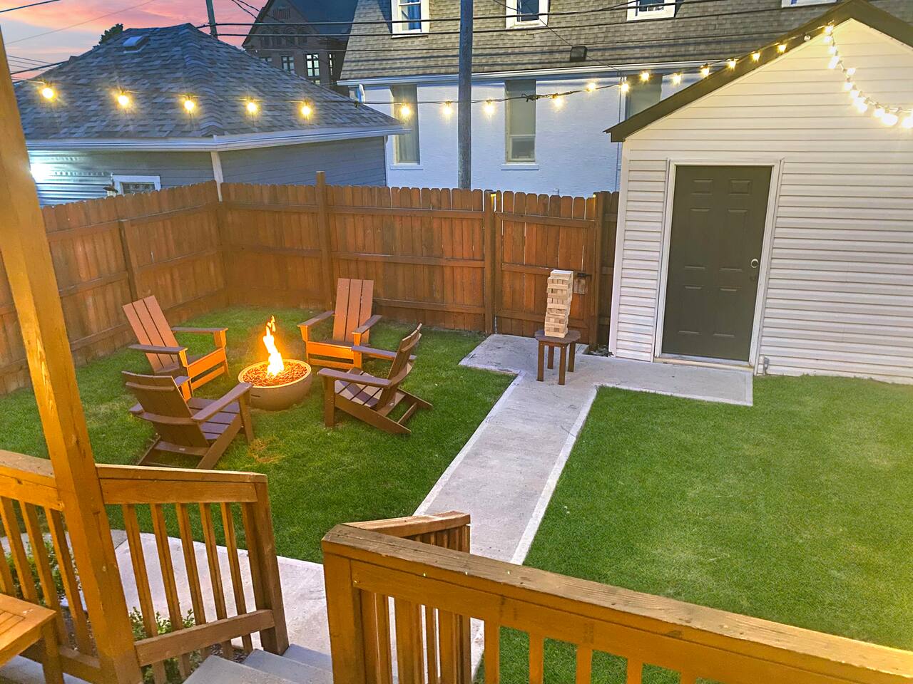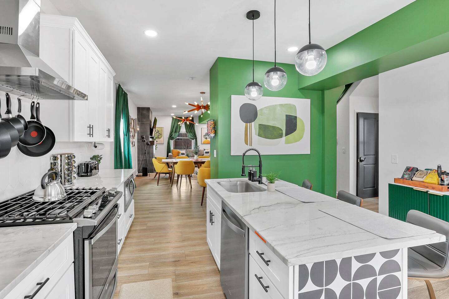 Swanky Suites is a Stupendous Stays property. Stupendous Stays is a small, family run hospitality company. KEY FEATURES: 🛏️ 4 bedrooms; 2 kings, 3 queens, 1 full size sofa bed 🛁 3.5 bathrooms; complimentary toiletries 🐶 DOG FRIENDLY (Dogs are allowed on a case by case basis. Requires approval before booking.) Mostly fenced in backyard. There is a 3-4' opening. 🧑🍳 Full kitchen w/ stainless steel appliances + coffee/tea bar 🏠 Bright, spacious living area 🔊 Record player and bluetooth soundbar in living room 🧑🧑🧒🧒 Family-friendly space w/ board games + coloring materials 🛜 High-speed wifi (FIBER) + Smart TVs 🧑💻 Workspace w/ monitors, mice, printer + ultra comfortable chairs 🅿️ Free parking street parking ⚽️ Backyard w/ fire pit, outdoor games, hammock ⭐️⭐️⭐️⭐️⭐️ Expect a Five Star stay with us. We have a full digital concierge to assist with booking activities, reservations, and more. Here’s what a few guests have said: 🗣️ "Evan was an amazing host and the property is absolutely stunning! This was one of the best stays we’ve ever had. Please book this place for your next stay! " -Brittany ✨ "Evan was an awesome host! We were in town for a wedding and his space held 10 of us comfortably. It was right next to where we had to go and parking was also very accessible. Evan was very fast to respond to me and was checking in to make sure everything went smoothly. Would definitely recommend staying here!" -Megan Stupendous Stays/Swanky Suites would love to be your home base for your Columbus travels! ⭐️⭐️⭐️⭐️⭐️ ☆☆ BEDROOMS ☆☆ This upscale retreat features four custom-designed bedrooms, so you can enjoy a unique and relaxing sanctuary at the end of the day. Each bedroom is equipped with a white noise machine, memory foam mattresses, and a Smart TV for your convenience. You’ll find three spacious bedrooms on the second floor. The first bedroom contains a plush king-sized bed with colorful accents and plenty of closet space to unpack all your belongings. Enjoy your favorite programs on the 43” Roku TV. The second bedroom features tranquil blue tones and a cushy king-sized bed. You’ll also find a closet with a pack-n-play, a stroller, and child safety items, so you don’t have to worry about bringing your own. There’s also a 55” Roku TV in this room. The third bedroom on the second floor features modern details, a comfy queen-sized bed, and an ensuite bathroom for ultimate privacy. There’s also a 55” Roku TV in this room. Make your way up to the top floor where you’ll find the fourth bedroom. Boasting two queen-sized beds, a cozy reading nook, and a stylish dresser, you’ll have everything you’ll need for a comfortable and unforgettable experience. There’s also a 55” Roku TV in this room. Each bedroom has a white noise machine and tower fan in it as well. If you need a little extra space to accommodate your group, there’s also a sofa bed in the living room. ☆☆ BATHROOMS ☆☆ The pristine bathrooms are the perfect place to get ready for your day on the town! There are three full bathrooms, each equipped with a hairdryer, fresh towels (including makeup towels), and Ginger Lily Farms shampoo, conditioner, and body wash. On the second floor, you’ll find two full baths, one boasting a beautiful tiled walk-in shower and the second containing a shower/tub combination, so you can choose between a relaxing soak or a quick rinse. The third floor has a spacious full bathroom with a tiled walk-in shower, a double vanity, and exposed brick, adding to the modern charm of the home Finally, you’ll also find a half bath on the main floor to cater to the common areas. In the half bath, there is a washer and dryer to keep your clothes clean! Laundry soap, a vacuum, a broom, and an iron and ironing board can all be found in the laundry room cabinet ☆☆ KITCHEN & DINING ☆☆ Whip up delicious meals in the sophisticated fully-equipped kitchen. You’ll find everything you’ll need, including an extensive array of cookware and dish-ware, so you never have to fret about running out of pots, pans, or cooking utensils. Chefs of your group will adore the high-end stainless steel appliances, sleek countertops, and exquisite cabinets. Enjoy a quick cleanup using the dishwasher. Dishwashing pods will be provided so you don’t have to worry about picking them up at the grocery store. In the fridge, you’ll even find complimentary butter, sugar, baking soda, and condiments for your convenience. Start your morning with a cup of coffee or tea, fresh from the complimentary coffee bar, stocked with whole bean and ground coffee, K-cups, cream, sugar, sweeteners, and tea. You can enjoy your beverage of choice at the sleek kitchen island by pulling up one of three stools. When you’re ready for a formal meal, make your way into the large dining area. Take a seat around the beautiful wooden dining table that can comfortably seat up to eight guests. Additional guests can enjoy dinner at the kitchen counter and still socialize, thanks to the open-concept layout. If you’re traveling with little ones, help yourself to the high chair located in the laundry room. The record player is located just beside the dining table, so you can enjoy some enchanting tunes while digging in. ☆☆ LOUNGE ☆☆ As you enter the home through the front door, you’ll be greeted by the swanky neon sign, a record player, and the contemporary lounge flooded with natural light. This chic space is the perfect place to gather with your group and enjoy quality time. Sit back on the sectional sofa and watch your favorite movie on the 65'' Roku TV with a soundbar for an immersive experience. When you’re not watching movies, enjoy some board games while kids of the group take advantage of the complimentary coloring books. ☆☆ HOME OFFICE ☆☆ Need to get some work done during your stay? You’ll find an unparal