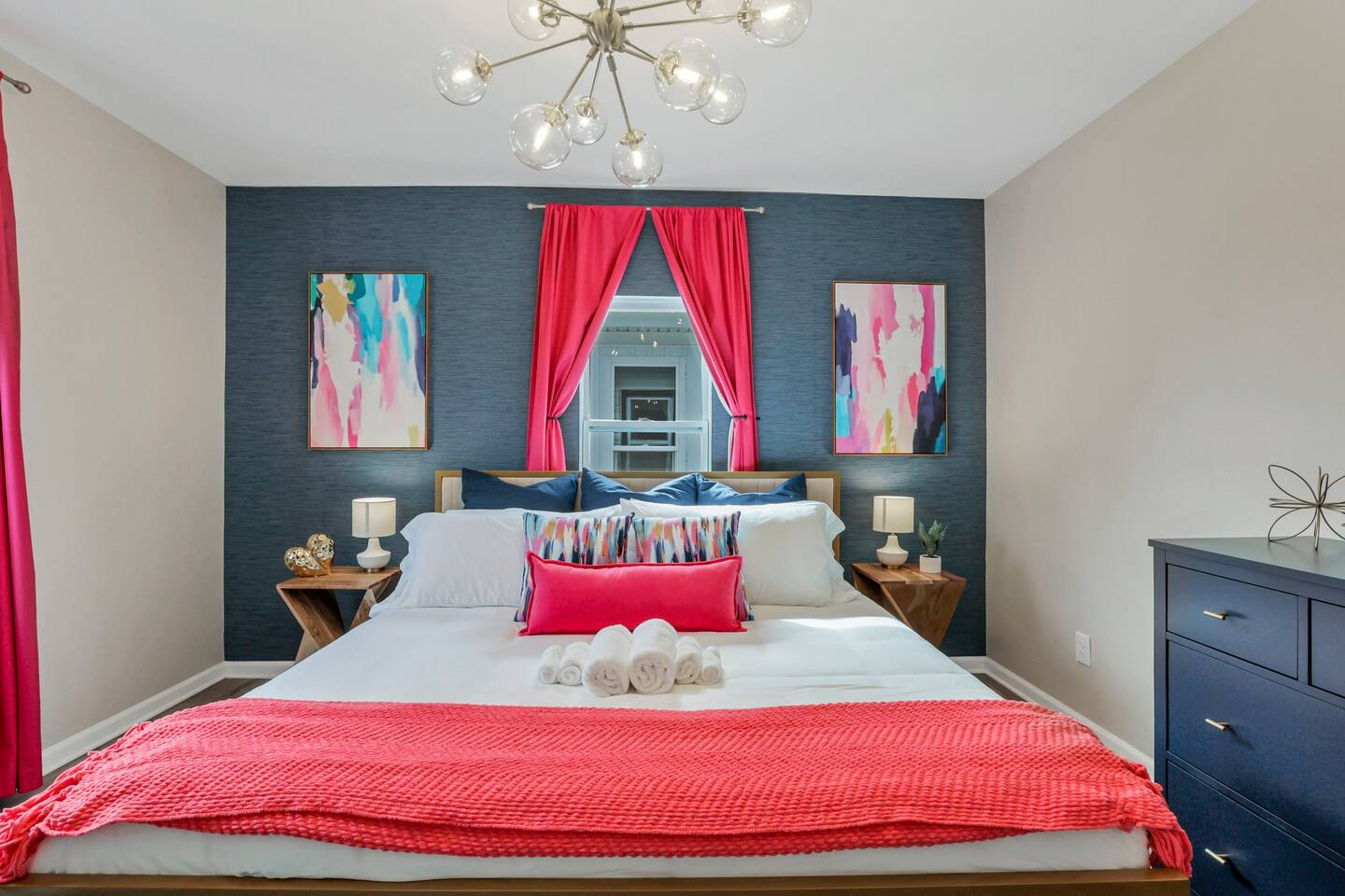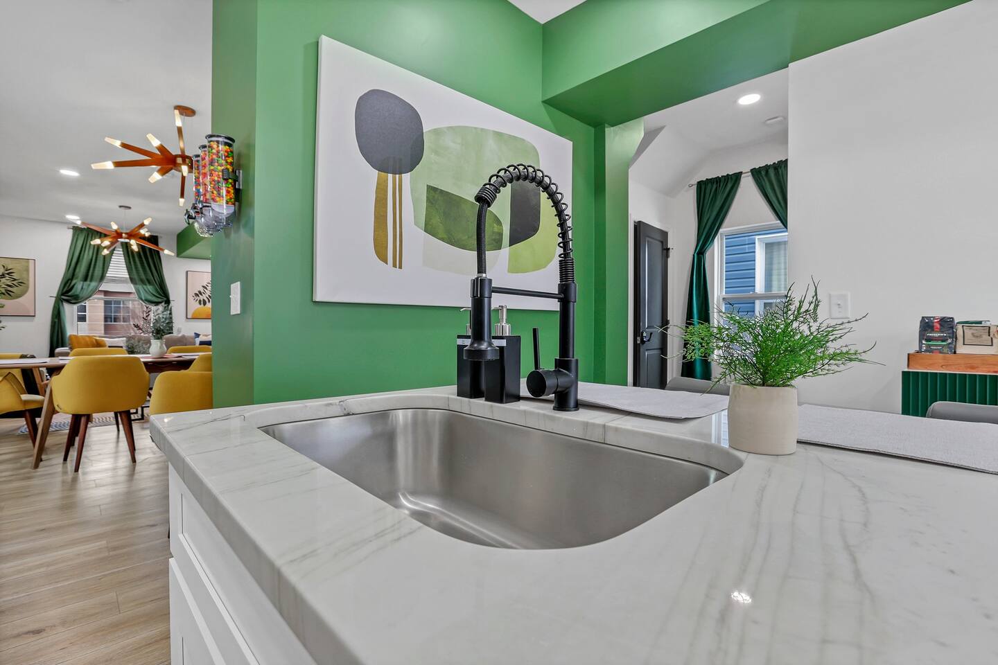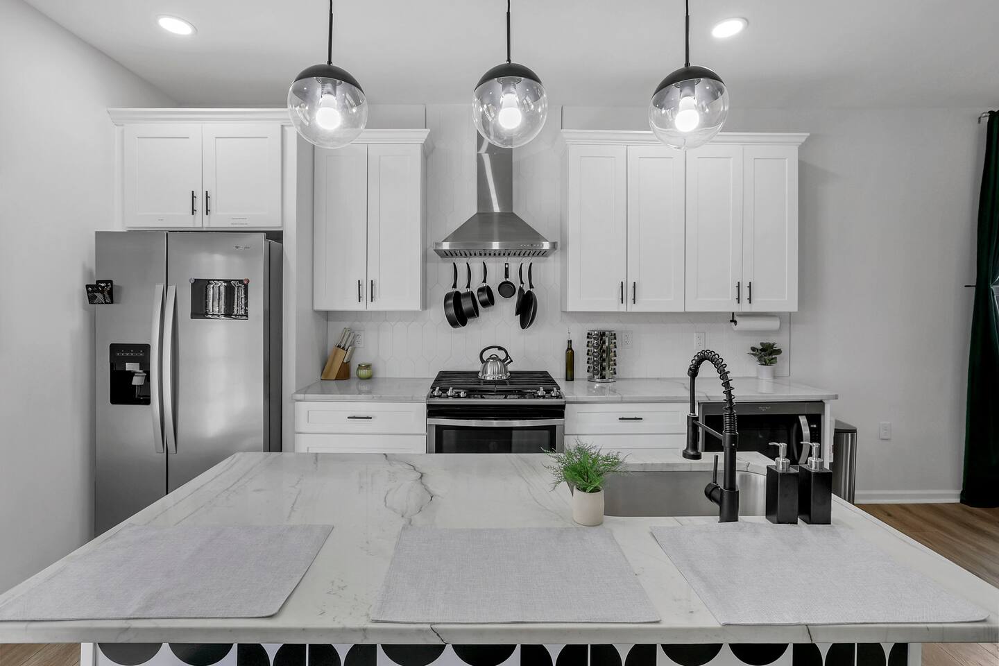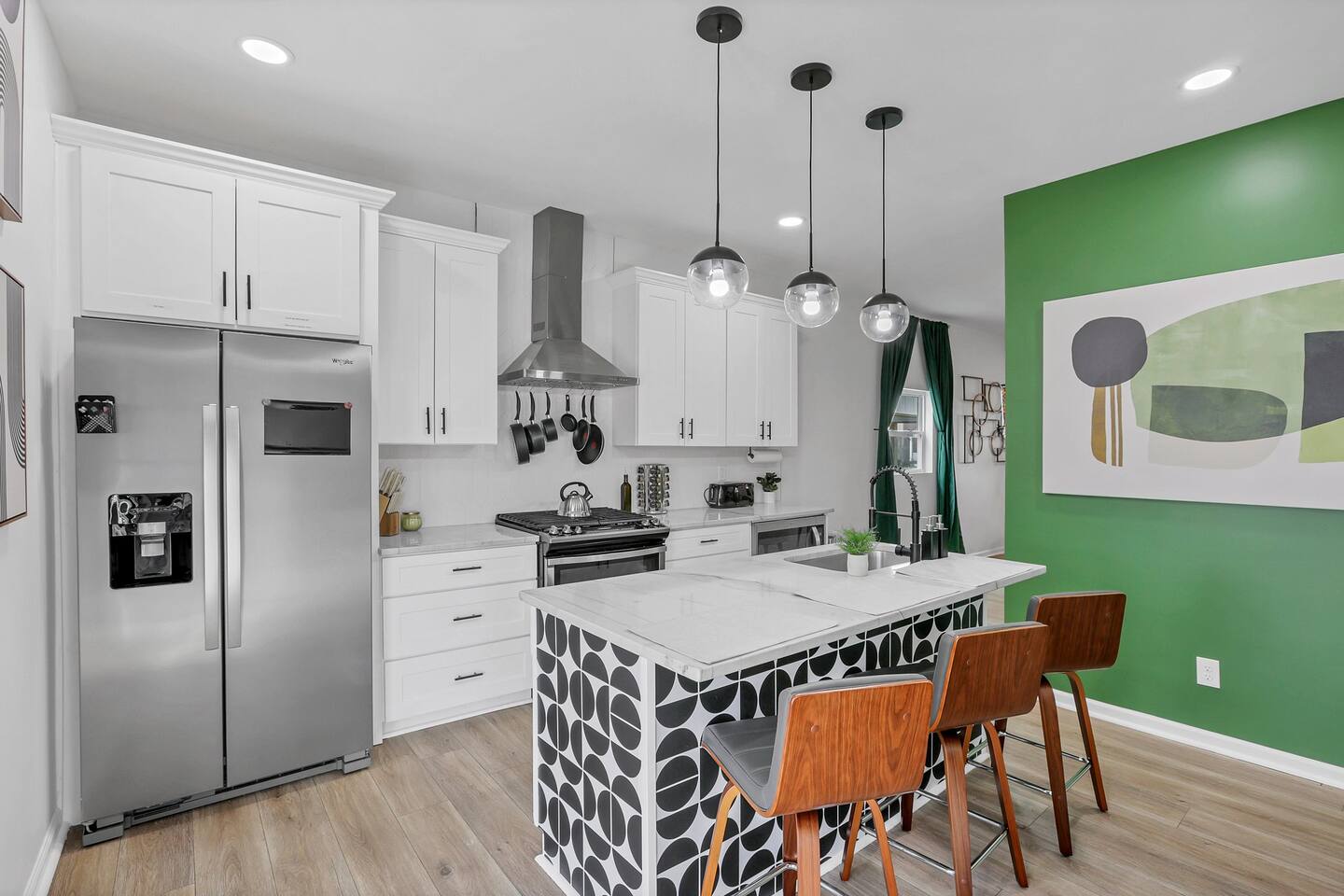Swanky Suites is a Stupendous Stays property. Stupendous Stays is a small, family run hospitality company. KEY FEATURES: 🛏️ 4 bedrooms; 2 kings, 3 queens, 1 full size sofa bed 🛁 3.5 bathrooms; complimentary toiletries 🐶 DOG FRIENDLY (Dogs are allowed on a case by case basis. Requires approval before booking.) Mostly fenced in backyard. There is a 3-4' opening. 🧑🍳 Full kitchen w/ stainless steel appliances + coffee/tea bar 🏠 Bright, spacious living area 🔊 Record player and bluetooth soundbar in living room 🧑🧑🧒🧒 Family-friendly space w/ board games + coloring materials 🛜 High-speed wifi (FIBER) + Smart TVs 🧑💻 Workspace w/ monitors, mice, printer + ultra comfortable chairs 🅿️ Free parking street parking ⚽️ Backyard w/ fire pit, outdoor games, hammock ⭐️⭐️⭐️⭐️⭐️ Expect a Five Star stay with us. We have a full digital concierge to assist with booking activities, reservations, and more. Here’s what a few guests have said: 🗣️ "Evan was an amazing host and the property is absolutely stunning! This was one of the best stays we’ve ever had. Please book this place for your next stay! " -Brittany ✨ "Evan was an awesome host! We were in town for a wedding and his space held 10 of us comfortably. It was right next to where we had to go and parking was also very accessible. Evan was very fast to respond to me and was checking in to make sure everything went smoothly. Would definitely recommend staying here!" -Megan Stupendous Stays/Swanky Suites would love to be your home base for your Columbus travels! ⭐️⭐️⭐️⭐️⭐️ ☆☆ BEDROOMS ☆☆ This upscale retreat features four custom-designed bedrooms, so you can enjoy a unique and relaxing sanctuary at the end of the day. Each bedroom is equipped with a white noise machine, memory foam mattresses, and a Smart TV for your convenience. You’ll find three spacious bedrooms on the second floor. The first bedroom contains a plush king-sized bed with colorful accents and plenty of closet space to unpack all your belongings. Enjoy your favorite programs on the 43” Roku TV. The second bedroom features tranquil blue tones and a cushy king-sized bed. You’ll also find a closet with a pack-n-play, a stroller, and child safety items, so you don’t have to worry about bringing your own. There’s also a 55” Roku TV in this room. The third bedroom on the second floor features modern details, a comfy queen-sized bed, and an ensuite bathroom for ultimate privacy. There’s also a 55” Roku TV in this room. Make your way up to the top floor where you’ll find the fourth bedroom. Boasting two queen-sized beds, a cozy reading nook, and a stylish dresser, you’ll have everything you’ll need for a comfortable and unforgettable experience. There’s also a 55” Roku TV in this room. Each bedroom has a white noise machine and tower fan in it as well. If you need a little extra space to accommodate your group, there’s also a sofa bed in the living room. ☆☆ BATHROOMS ☆☆ The pristine bathrooms are the perfect place to get ready for your day on the town! There are three full bathrooms, each equipped with a hairdryer, fresh towels (including makeup towels), and Ginger Lily Farms shampoo, conditioner, and body wash. On the second floor, you’ll find two full baths, one boasting a beautiful tiled walk-in shower and the second containing a shower/tub combination, so you can choose between a relaxing soak or a quick rinse. The third floor has a spacious full bathroom with a tiled walk-in shower, a double vanity, and exposed brick, adding to the modern charm of the home Finally, you’ll also find a half bath on the main floor to cater to the common areas. In the half bath, there is a washer and dryer to keep your clothes clean! Laundry soap, a vacuum, a broom, and an iron and ironing board can all be found in the laundry room cabinet ☆☆ KITCHEN & DINING ☆☆ Whip up delicious meals in the sophisticated fully-equipped kitchen. You’ll find everything you’ll need, including an extensive array of cookware and dish-ware, so you never have to fret about running out of pots, pans, or cooking utensils. Chefs of your group will adore the high-end stainless steel appliances, sleek countertops, and exquisite cabinets. Enjoy a quick cleanup using the dishwasher. Dishwashing pods will be provided so you don’t have to worry about picking them up at the grocery store. In the fridge, you’ll even find complimentary butter, sugar, baking soda, and condiments for your convenience. Start your morning with a cup of coffee or tea, fresh from the complimentary coffee bar, stocked with whole bean and ground coffee, K-cups, cream, sugar, sweeteners, and tea. You can enjoy your beverage of choice at the sleek kitchen island by pulling up one of three stools. When you’re ready for a formal meal, make your way into the large dining area. Take a seat around the beautiful wooden dining table that can comfortably seat up to eight guests. Additional guests can enjoy dinner at the kitchen counter and still socialize, thanks to the open-concept layout. If you’re traveling with little ones, help yourself to the high chair located in the laundry room. The record player is located just beside the dining table, so you can enjoy some enchanting tunes while digging in. ☆☆ LOUNGE ☆☆ As you enter the home through the front door, you’ll be greeted by the swanky neon sign, a record player, and the contemporary lounge flooded with natural light. This chic space is the perfect place to gather with your group and enjoy quality time. Sit back on the sectional sofa and watch your favorite movie on the 65'' Roku TV with a soundbar for an immersive experience. When you’re not watching movies, enjoy some board games while kids of the group take advantage of the complimentary coloring books. ☆☆ HOME OFFICE ☆☆ Need to get some work done during your stay? You’ll find an unparal