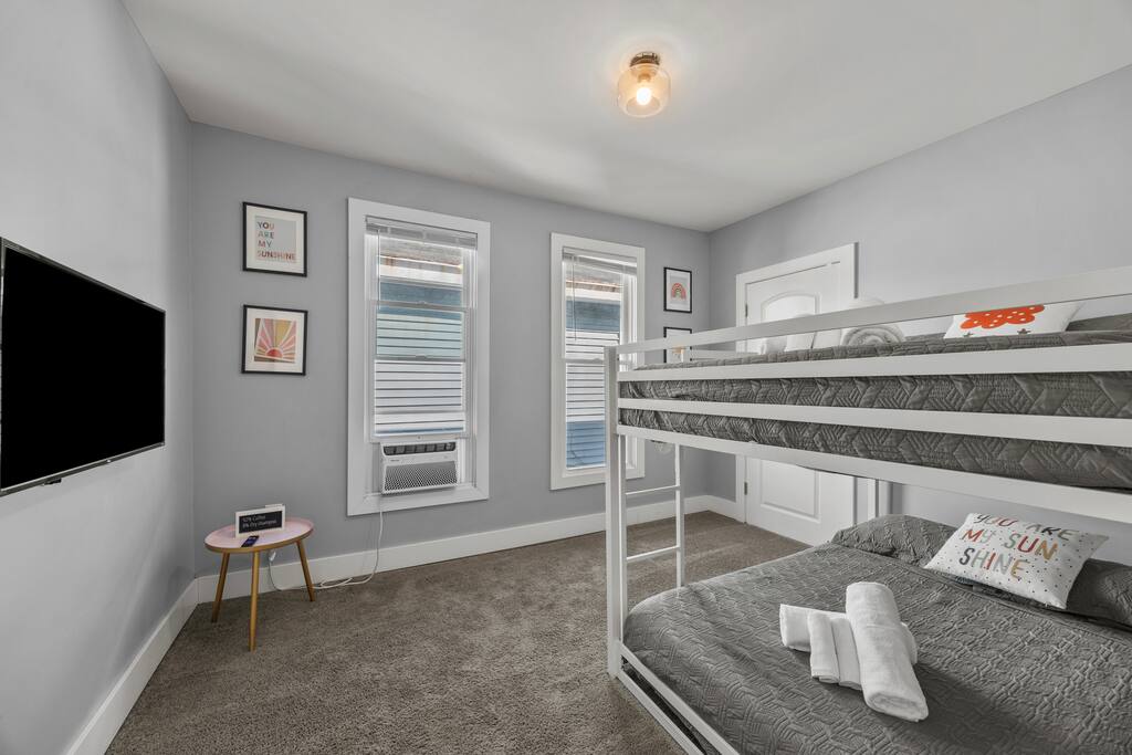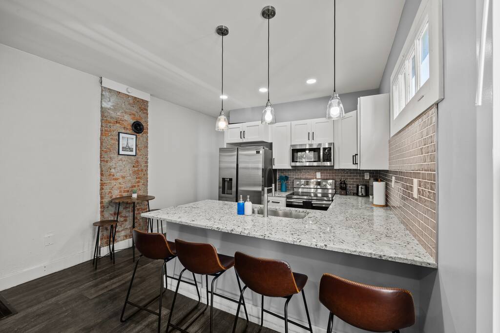 Thanks for considering stay with us! This is a Stupendous Stays hosted property. Stupendous Stays is a small, family run hospitality company. ☀ Sleeps 6 comfortably ☀ 2 bedrooms | 1.5 bathrooms ☀ Dogs allowed (pre-approval required) ☀ Backyard hot tub & BBQ grill ☀ Fully fenced yard – great for dogs & kids ☀ Dedicated office space with desk & hanging chair ☀ Fully equipped kitchen with Keurig coffee maker ☀ Free washer/dryer and high-speed Wi-Fi ☀ Minutes to Short North, German Village, OSU, COSI & Nationwide Arena ☆☆ BEDROOMS ☆☆ Both bedrooms are on the 2nd floor for added privacy. • Primary Bedroom – King bed, TV, closet, room-darkening shades, and soft lighting for restful nights. • Second Bedroom – Queen-over-Queen bunk bed and TV, ideal for families or groups. Each space is thoughtfully designed for relaxation, with plush bedding and plenty of natural light. ☆☆ BATHROOMS ☆☆ The home includes 1.5 bathrooms: a full bath upstairs with a shower/tub combo, and a convenient half bath on the main floor. Each bathroom is stocked with shampoo, conditioner, body wash, and fresh towels — everything you need for a refreshing stay. ☆☆ KITCHEN & RELAXING AREAS ☆☆ The open kitchen shines with stainless steel appliances, granite countertops, and all the cookware and essentials for easy meals. Brew a morning coffee at the Keurig before settling into the bright living area, where a plush teal sectional, TV, and exposed brick fireplace create the perfect gathering space. ☆☆ OUTSIDE SPACE ☆☆ Step into your private fenced backyard featuring a hot tub, BBQ grill, patio seating, and string lights for cozy evenings under the stars. Free and plentiful street parking keeps things easy. You’ll be near Columbus favorites — Short North, German Village, Brewery District, Franklin Park Conservatory, COSI, Lou Berliner Park, Nationwide Arena, Schiller Park, Huntington Park, Lower. com Field, The Ohio State University, and major hospitals like Nationwide Children’s and OSU Wexner Medical Center. ★☆ Book Today & Let Us Take Care Of You ☆★ Whether you’re here for work, family, or a city escape, this stylish duplex is designed for comfort, connection, and convenience. Book your stay now and enjoy your own Columbus retreat — hot tub, home comforts, and all!