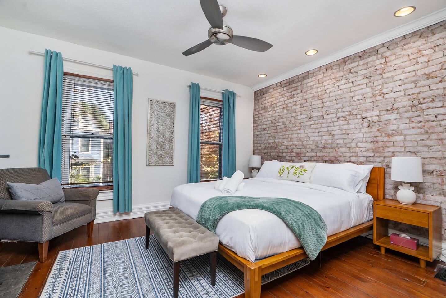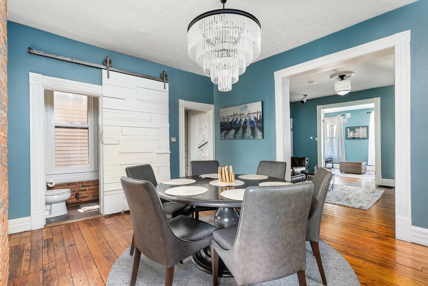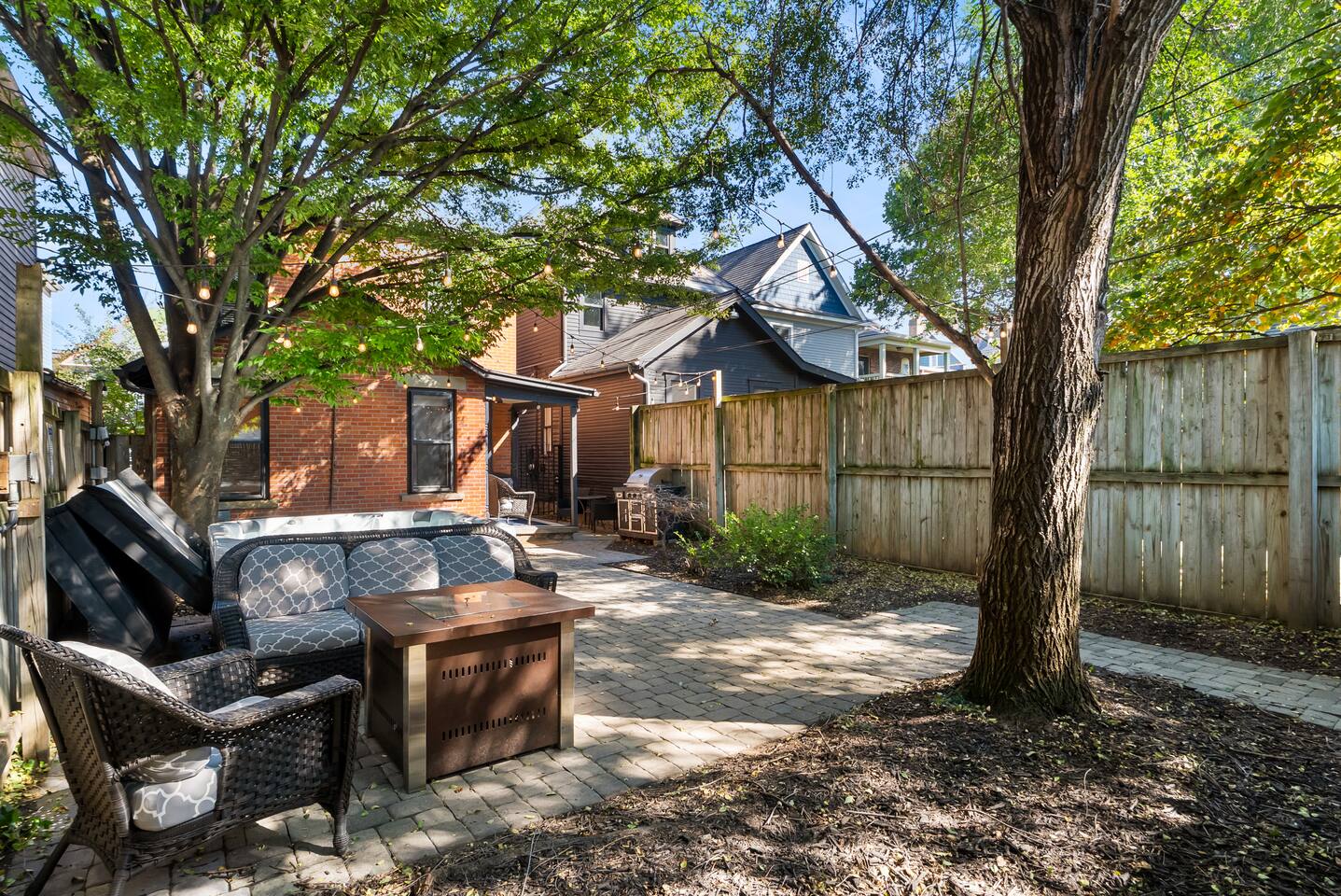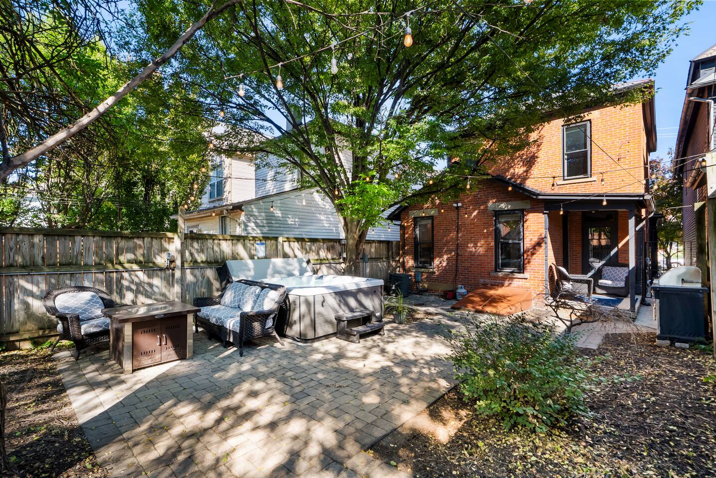 Historic charm meets modern comfort in this 3BR/2BA brick home in Italian Village. Sleeps 8 w/ Cali king, 2 queens & queen sofa bed. Enjoy original hardwoods, exposed brick, owners’ artwork, and a fully fenced backyard oasis w/ hot tub, fire pit, grill & string lights. Walk to Short North Arts District! Dogs allowed w/ pre-approval. 2–3 off-street parking spots + paid street parking.